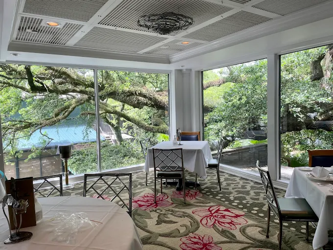 Inside, the restaurant feels elegant but relaxed. Large windows bring in natural light, and the dining rooms carry a timeless charm.