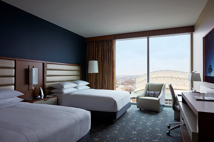 The Marriott Marquis Houston is famous for one thing: the lazy river that overlooks the downtown skyline. Yes, you can float in a tube and stare at the high rises of Texas. It is a wild, fun experience that families absolutely love.
