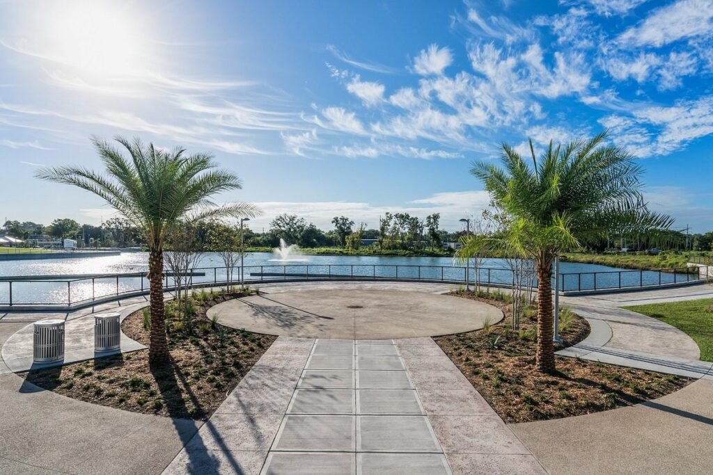 Depot Park is the city’s sparkling new backyard. The centerpiece is a gorgeous, turquoise-blue stormwater pond that looks like a natural spring.