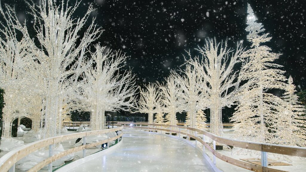 The air is filled with the sound of music and skates scratching the ice, and the whole place is wrapped in the warm glow of string lights.
