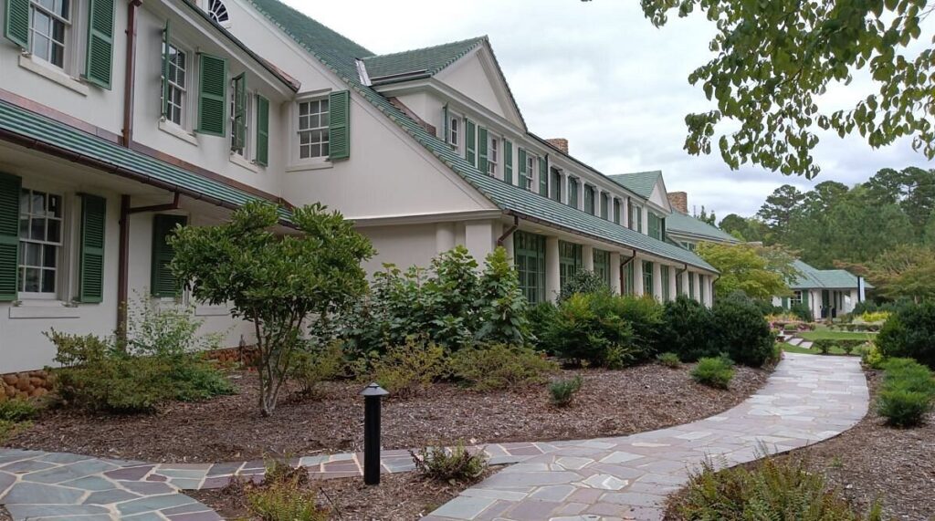 The Manor House is stunning against a winter sky. It’s a multifaceted destination in Winston-Salem for winter that blends festive excitement with peaceful natural retreat.